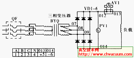 直流磁場部分包括直流磁場調壓電源和直流磁場發生裝置。直流磁場調壓電源電路設計如圖2所示。直流磁場發生裝置外形尺寸為500 mm× 500mm× 750mm。為使磁場達到一般磁場熱處理要求,同時控制線圈外形尺寸不宜過大,需對線圈進行設計。設線圈長度為L, 線圈匝數為N, 線圈電流為I ,則磁場