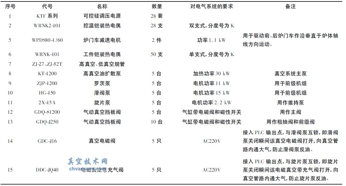 對于真空釬焊工藝來說,釬焊爐最重要的兩個性能是真空度和加熱性能,機械系統和電氣控制系統都是圍繞著這兩個性能來進行設計,為了實現釬焊爐的功能,這兩大系統是密不可分的。設備用電點即是設備的機械系統中和電氣控制相關的點,也就是機械系統和電氣控制系統的結合點,表1 匯總了該設備的關鍵用電點: