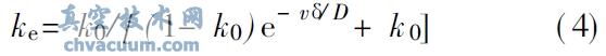 電子束真空熔煉后, 再利用定向凝固實現提純。為了描述界面薄層處雜質濃度的偏離對固相中雜質濃度的影響, 把固液界面兩側雜質濃度比值稱為有效分配系數k e。平衡分配系數k0 與有效分配系數k e 之間的關系可以用式(4) 表示