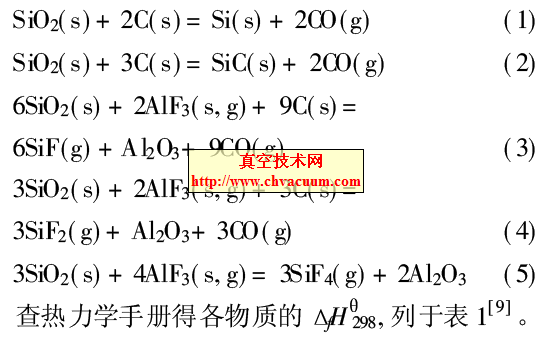 (1) 熱力學結論: 在100 kPa 時, SiO2 與還原碳反應, 在1952 K 以上生成Si 和CO, 在1780 K 以上才能生成SiC 和CO; 當系統殘余壓力為100~ 10 Pa 內時, 在1465~ 1352 K 以上即可生成Si 和CO, 在1329~ 1225 K 以上即可生成SiC 和CO, 在1464~ 1353 K以上即可生成SiF, 在1062~ 979 K 以上即可生成SiF2, 在814~ 746 K 以上即可生成SiF4。