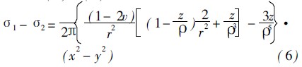 我們知道,在支撐物與玻璃相互接觸位置點處為三向應力狀態,在該接觸點取一微小單元體,在支撐物與玻璃的接觸面上,有接觸應力R3,由于R3 的作用,單元體將向周圍膨脹,于是引起周圍玻璃對它的約束應力R1 和R2。由于實際支撐物結構尺寸很小,因此,支撐點處可以把支撐力看作為集中荷載,玻璃看作半無限大平面體。根據接觸理論,垂直作用在表面原點上的集中力P 在接觸點附近平面內產生的應力按如下公式計算: