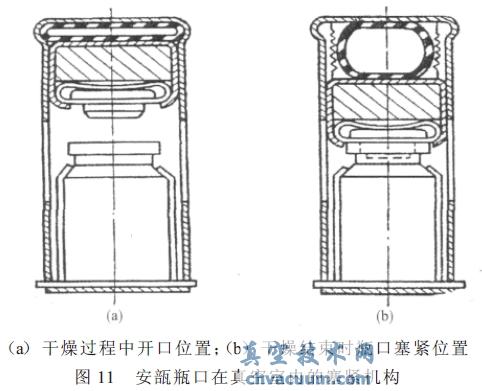 在真空中小瓶口塞緊機(jī)構(gòu)如圖11 所示。在圖11(a)上所示為小瓶直接安置在干燥室內(nèi),待干燥的物料裝入小瓶?jī)?nèi),在干燥過(guò)程結(jié)束后,用專設(shè)的壓縮空氣系統(tǒng)的壓力作用下,借這種辦法將瓶塞壓緊如圖11(b)所示。然后向干燥室內(nèi)放入大量空氣后小瓶從設(shè)備中取出。