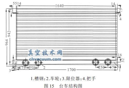 物料溫度為- 40℃,結(jié)冰的物料裝在托盤里,放在臺(tái)車的架子上(圖15),存放在冷凍室內(nèi),在8 h 內(nèi),往冷凍室裝滿56 托盤120 kg 被凍結(jié)的原料(物料由屠宰場(chǎng)分批供給)。冷凍室內(nèi)的溫度約為- 30℃。冷凍室與干燥室通過(guò)斷面為700×1000 mm2 的真空閘板閥相聯(lián)。臺(tái)車裝滿盤子后,可打開閥門將臺(tái)車推進(jìn)干燥室,沿斜坡到達(dá)干燥室端蓋緩沖器的擋板處。臺(tái)車進(jìn)入后與末端開關(guān)相碰,自動(dòng)關(guān)閉真空閥門。同時(shí)端蓋密封。干燥室經(jīng)過(guò)一個(gè)真空閥門(內(nèi)徑500mm)與對(duì)應(yīng)的升華凝結(jié)器相連。而升華凝結(jié)器由真空主管道(內(nèi)徑80 mm)與三臺(tái)BH- 1Г 型機(jī)械真空泵相連,構(gòu)成預(yù)真空系統(tǒng)。在干燥周期內(nèi),只利用一臺(tái)真空泵工作。