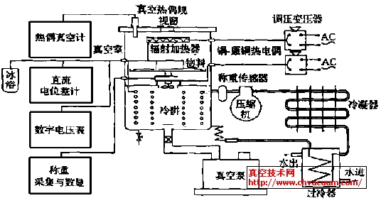 番茄的凍干設(shè)備采用我們自行設(shè)計(jì)制造的小型實(shí)驗(yàn)用蔬菜凍干機(jī)。該機(jī)主要由凍干箱、水汽凝結(jié)器、制冷系統(tǒng)、真空系統(tǒng)、加熱系統(tǒng)和測(cè)控裝置六部分組成, 如圖1 所示。物料、電加熱器、冷阱溫度均采用標(biāo)定過(guò)的銅—康銅熱電偶測(cè)量, 測(cè)溫精度可達(dá)±0. 3℃; 凍干箱內(nèi)壓力測(cè)量選用RZJ-53B 型真空熱偶規(guī), 其最佳量程在10~100Pa; 物料重量測(cè)量采用經(jīng)過(guò)改裝的YP600型電子天平, 測(cè)量精度±0. 2g。
