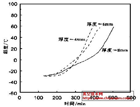 實(shí)驗(yàn)用番茄選擇成熟質(zhì)硬的新摘番茄, 經(jīng)過(guò)一定的預(yù)處理后, 橫切成4mm、6mm 和8mm 的薄片,進(jìn)行凍干實(shí)驗(yàn)。實(shí)驗(yàn)測(cè)量得到不同物料厚度下的冷凍干燥曲線, 結(jié)果如圖2 所示。