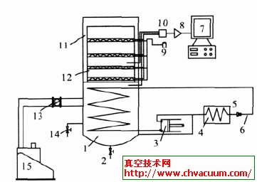 1. 冷阱 2. 放水閥3. 壓縮機4. 冷凝器5. 過濾器6. 毛細管 7. 計算機 8.A/D 板9. 電加熱器10. 熱電偶接線端子11. 干燥室12. 隔板13. 蝶閥14. 放氣閥15. 旋片泵