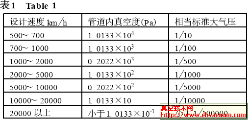瑞士Swissmetro系統的目標速度不超過700km/h , 考慮采用1/10 個大氣壓的真空度, 即1. 0133×104 Pa。這是以超音速飛機為參照確定的,超音速飛機的飛行速度是每小時2000多公里, 飛行高度15000~18000m , 這一高度的真空度大約是1/10個標準大氣壓。