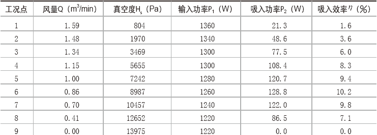 根據真空技術網提供的資料,在額定電壓、額定功率下運轉時,1000W以上功率家用真空吸塵器的最大真空度值不能小于15680 ,最大吸入效率不能小于12%。因此,該款吸塵器沒有達到國家標準。為了找出問題所在,對單獨電風機系統進行空氣性能測試。測試結果如表2。