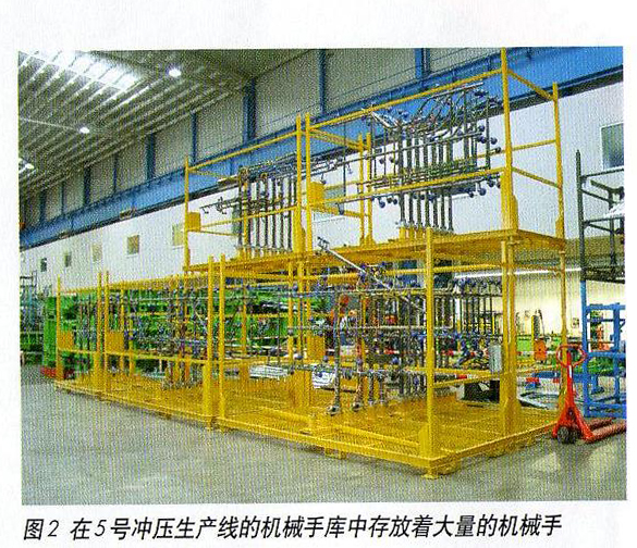 圖4 沖壓生產線中運送轎車側板箱的機器人,它所使用的吸嘴是橢圓型的波管式吸嘴,可以與被沖壓板材的表面形狀很好的匹配