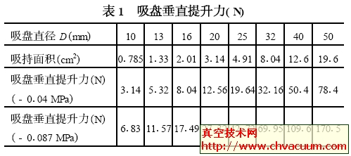 查表1得直徑40的真空吸盤在-0.04MPa 氣壓下能產(chǎn)生垂直提升為50.4N,而一塊3kg重的玻璃的重量為29.4N,垂直提升力/實際提升重量=50.4/29.4= 1.71<n=2.5,因此用現(xiàn)有的<40的丁腈橡膠真空吸盤不能確保完成任務(wù),危險性太大。故應(yīng)重新考慮真空吸盤的直徑,或改變真空壓力。例如選用<50 的真空吸盤在-0.04 MPa 氣壓下工作或選用<40的真空吸盤在-0.087MPa 氣壓下工作均可完成此任務(wù)。