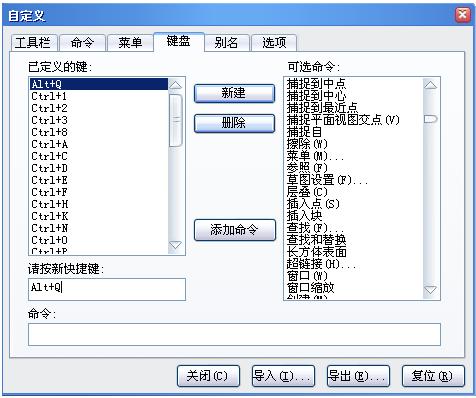 打開菜單----工具----自定義----鍵盤,在彈出的窗體中,我們可以自行設置一些最常用的快捷命令。具體的操作如下: