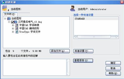 如果實施了上述三個技巧以后仍然達不到我們的要求,那么還有一個技巧,就是利用WINRAR文件的壓縮功能。在傳送DWG文件前,用WINRAR壓縮,效果比較好,幾乎只有原來的40%左右;蛘卟捎弥型鸆AD 2009中的"電子傳遞"功能,它能夠進行智能化的圖紙壓縮處理,壓縮包中不僅包含了DWG文件,而且還可以按照需要打包圖紙中的字體文件和字體映射表,更進一步方便了彼此之間的圖紙交流。如圖: