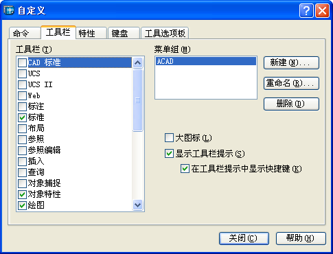 在AutoCAD 2009中,有29個已命名的工具欄,每個工具欄分別包含從2個到20個不等的工具。打開“視圖”菜單具,選擇“工具欄”命令,如圖2所示。在這里,您可以打開或關閉工具欄。