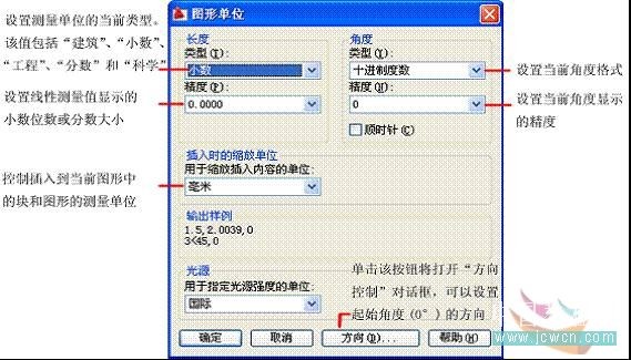 在中文版AutoCAD 2009 中,用戶可以選擇“格式”|“單位”命令,在打開的“圖形單位”對話框中設置繪圖時使用的長度單位、角度單位,以及單位的顯示格式和精度等參數。