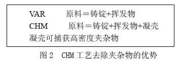 PACHM 工藝在去除夾雜方面的優(yōu)勢如圖2所示。VAR 熔煉時,電極中的物質(zhì)除了能揮發(fā)外,其它所有物質(zhì)(包括高低密度夾雜)熔煉后又留在鑄錠中,去除LDI的唯一途徑只在通過熔池溶解,但溶解效果非常有限,即使經(jīng)過很多次熔煉也不容易將這些夾雜去除,所以VAR熔煉對原料的要求非常嚴(yán)格。與VAR 相比,CHM 工藝可看作是一個開放的系統(tǒng)[5],即使原料中混入了高密度夾雜物,在熔煉時,這些夾雜物可以通過沉淀進入凝殼中,從而巧妙地與鑄錠分離。