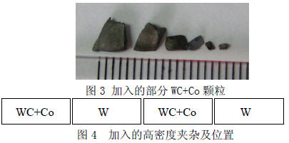 為了研究冷床爐熔煉工藝對高低密度夾雜的去除效果,熔煉前在原料中加入了純W和硬質(zhì)合金刀具碎塊。熔煉總共需四只壓塊(Φ130×300mm),在其中分別鉆孔,孔大小為Φ7×10 ㎜,加入的夾雜物尺寸及位置如下:
