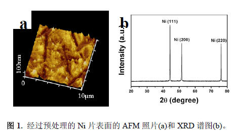 圖1a 是預處理后Ni 片表面的AFM 照片,可看出Ni 片表面有許多高低起伏的突起和凹陷,粗糙度約100 nm。XRD 譜(圖1b)中所有衍射峰均可歸屬為立方相Ni(JCPDS65-0380),沒有其它的衍射峰,說明Ni 片的品質較純。