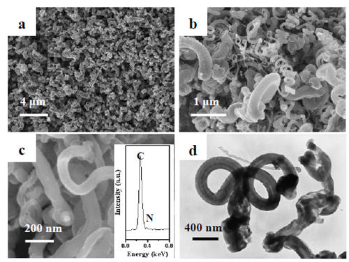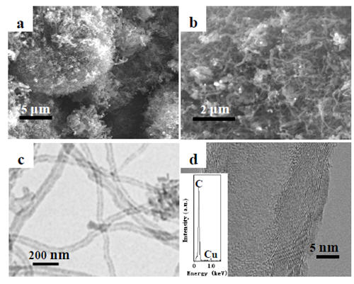 圖2. Ni 片上CNTs 的SEM (a-b),TEM (c)和HRTEM (d)照片。d中插圖為相應的EDS譜! D3. Ni 片上N-CNTs 的SEM (a-c) 和TEM (d)照片。(c)中插圖為是相應的EDS 譜圖。
