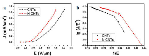 圖4. 在Ni片上生長的CNTs和N-CNTs的場發射結果:(a) J-E曲線,(b) F-N曲線 表1. 生長在Ni片上的CNTs和N-CNTs的場發射結果