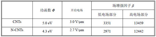 由上述結果可知,在低電場部分,CNTs 的β 值要大于N-CNTs。由于此時空間電荷效應的作用還不明顯,β主要反映了樣品的幾何形貌,顯然直徑較小的CNTs 的β 也較大。但是由于N-CNTs 的管壁上有很多的缺陷,更有利于電子逸出,其Φ 也低于CNTs,且N原子的加入改善了CNTs 的電子輸運性能,所以在上述因素的綜合作用下,N-CNTs 具有更低的Eto,即有更好的場發射性能。