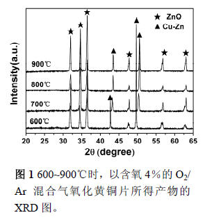 將含鋅30 wt%的市售Cu-Zn 合金(Cu0.66Zn0.34)片用SiC 砂紙磨光,依次在丙酮、乙醇、蒸餾水中超聲清洗10min,晾干備用。將處理過的黃銅片放在剛玉片上,置于水平管式爐中心。在Ar 氣保護(hù)下,以15℃/min 的升溫速率快速升溫至反應(yīng)溫度(600~900℃),然后引入適量的2/Ar混合氣,O2 的體積含量為2~12%,反應(yīng)持續(xù)1 小時(shí)。反應(yīng)結(jié)束后,在Ar氣保護(hù)下將體系冷卻到室溫,在黃銅合金片上得到白色或灰白色的產(chǎn)物。