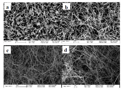 圖2. 以含氧4%的O2/ Ar 混合氣氧化黃銅片所得產(chǎn)物的SEM 照片。(a) 600℃,(b) 700℃,(c) 800℃,(d)900℃