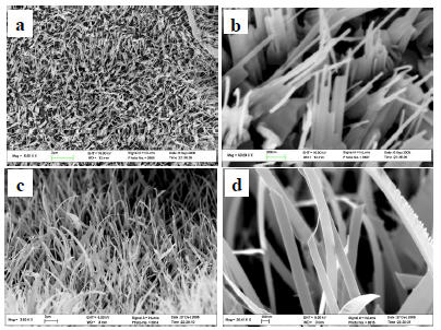 圖3. (a-b) 準(zhǔn)定向納米棒陣列的SEM 照片;(c-d) 準(zhǔn)定向納米帶陣列的SEM 照片。