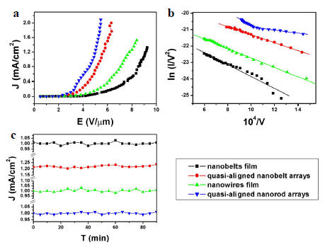 圖4. 不同形貌的ZnO一維納米結(jié)構(gòu)場發(fā)射性能。(a) J-E曲線;(b)F-N曲線;(c) J-T曲線。
