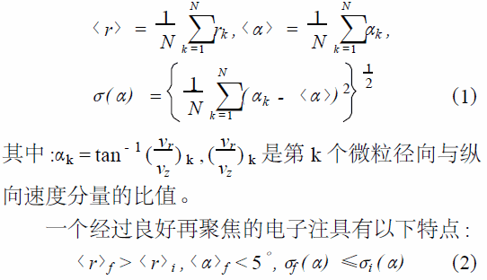 多級降壓收集極通常被分為散群聚區和降壓收集極區兩部分分別進行分析,所謂散群聚區是指從高頻輸出腔出口到收集極入口這一漂移段。在散群聚區已經基本上沒有高頻電場的作用,磁場的聚焦作用也在減弱,但互作用后的電子的空間群聚依然存在,電子注的紊亂度較大,除此之外,快電子超越慢電子,產生軌跡交叉,故廢電子注能量及角度范圍較大。為有效收集廢電子,在散群聚區加上再聚焦磁場進行改善。它有兩方面的目的:減小空間電荷力的作用;減少電子注中橫向速度分量,使之變成可以被回收的縱向速度分量。衡量再聚焦區的標準是其對廢電子注層流性的改善程度。電子注的特性可用平均半徑〈r〉、平均角度〈α〉及角度偏差σ〈α〉來表示,σ〈α〉(均方根) 是衡量電子注層流性的量。對于一個包含N 個微粒的電子注,這些量的表達式為