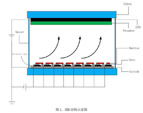 SED的基本原理即為場致發(fā)射,但與一般的場致發(fā)射也是有一定的區(qū)別的,它主要依靠在陽極上施加一高電壓(一般在幾千伏),在真空環(huán)境下將由陰極板產(chǎn)生的表面?zhèn)鲗?dǎo)電流拉向陽極,轟擊在陽極板上熒光粉而發(fā)光。在實(shí)驗(yàn)中我們對柵極施加一電壓,而陰極接地,這樣?xùn)艠O與陰極間便產(chǎn)生一電勢差,在這一電勢差的影響下,發(fā)射體薄膜層中就會(huì)有傳導(dǎo)電流產(chǎn)生,最后在陽極電壓的作用下,傳導(dǎo)電流中的部分電子被提取來轟擊熒光粉,從而達(dá)到發(fā)光的目的。若在柵極通過外部電路施加掃描電壓,便可實(shí)現(xiàn)陣列顯示與灰度控制,也就是實(shí)現(xiàn)了SED 在顯示中應(yīng)用。下圖是我們目前所采用的SED 結(jié)構(gòu)示意圖: