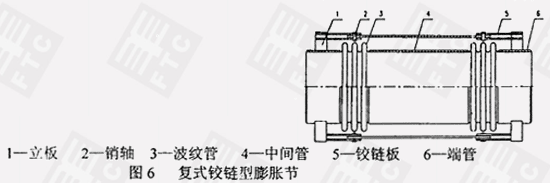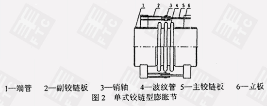 由一個波紋管及銷軸、鉸鏈板和立板等結構件組成、承受波紋管壓力推力的膨脹節(見圖2) 。