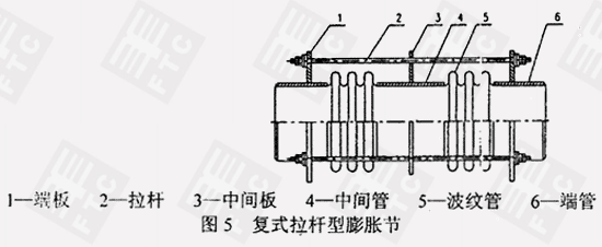 由中間管所連接的兩個波紋管及拉桿和端板等結構件組成、能吸收任一方向橫向位移并能承受波紋管壓力推力的膨脹節,(見圖5)。