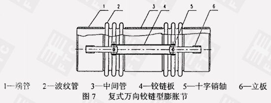 由中間管所連接的兩個波紋管及十字銷軸、鉸鏈板和立板等結構件組成、能吸收一方向橫向位移并能承受波紋管壓力推力的膨脹節(見圖7)。