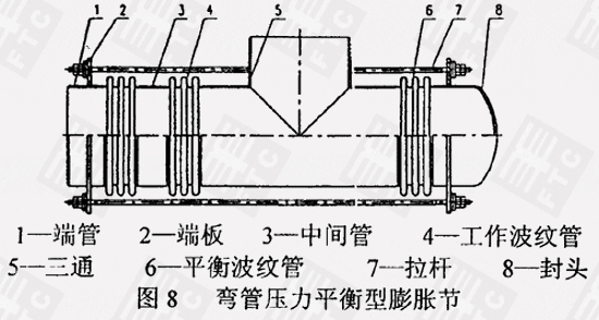 由一個或中間管所連接的兩個工作波紋管和一個平衡波紋管及彎頭或三通、封頭、拉桿和端板等結構件組成、主要用于吸收軸向與橫向組合位移并能承受波紋管壓力推力的膨脹節(見圖8)。