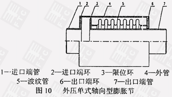 由承受外壓的波紋管及外管和端環等結構件組成、只用于吸收位移而不能承受波紋管壓力推力的膨脹節(見圖10)。