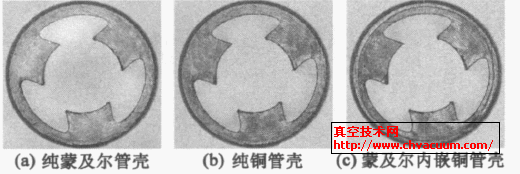 研究中制備了三種不同材料的管殼:純蒙乃爾管殼、純銅管殼和蒙乃爾內部嵌銅管殼。其中,蒙乃爾內嵌銅管殼的制備方法如下:首先在銅內殼的外表面電鍍8μm 的銀膜,并將其滑配裝入蒙乃爾管殼內部,然后將兩部分焊接在一起。內殼的厚度與外殼相近,兩個殼的總厚度為普通管殼的厚度。采用內嵌管殼,既可以利用蒙乃爾的高機械強度,又可以兼顧銅的高導熱和高導電性能。不同管殼的實物圖如下: