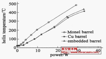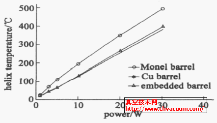 不同材料管殼的使用對慢波系統的散熱性能具有一定的影響。研究表面,蒙乃爾管殼的導熱能力較差,采用蒙乃爾內嵌銅管殼可以在一定程度上改善慢波系統的散熱性能。