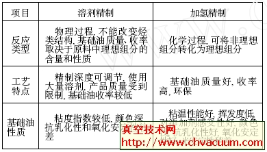 潤滑油加氫處理是近年來發展起來的臨氫轉化生產工藝, 其主要作用是對油品進行化學改質, 大幅度改善基礎油的粘溫性能和脫除大量雜質, 將多環芳烴、膠質、瀝青質等非理想組分轉化為理想組分。與目前普遍應用的溶劑精制工藝相比, 加氫精制工藝有許多優點, 表1 中對兩種精制工藝的相關內容進行了比較。