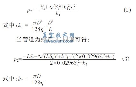 注意,上面兩式中Sp 實際上是對應泵入口壓力p2 下的抽速,在Sp 未知的情況下,僅在抽速Sp 為常數的壓力范圍內有解。當抽速隨著真空泵入口壓力變化時,因Sp 是隨著p2 變化的,而p2 未知,所以無法確定抽速Sp,從而無法計算管道的平均壓力。