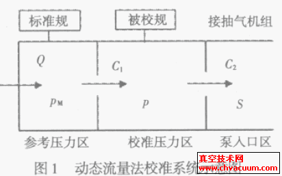 動態流量法是將已知流量的氣體連續的注入到校準室中,通過已知流導抽氣,在校準室中建立起動態平衡壓力。這是運用于高真空和超高真空區間校準真空規的一種優良的絕對方法。如圖1 所示。