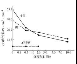 下圖6給出了相同尺寸的可伐合金、Ni與不銹鋼試樣的CO出氣率與燒濕氫時間的關系。燒濕氫半小時后,可伐的CO出氣率降低45%以上,Ni降低約32%。只有不銹鋼例外,盡管它含碳量較高,但燒濕氫并不能減小不銹鋼的CO出氣率,這說明不銹鋼的出氣機制與其他材料不同。