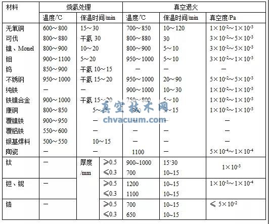 常用材料的燒氫和真空退火規(guī)范見表2。表中所列的干氫,是指露點低于-50℃,水汽分壓力小于10-1Pa的氫氣,適用于含碳量少,需要去除表面氧化物而不增加含氧量的材料。對于支架和彈簧等預應力零件,其烘烤溫度應低于退火溫度。鋁零件因熔點較低,其烘烤溫度一般不超過500℃。對于厚壁或直徑大的工件,則應適當延長退火時間。
