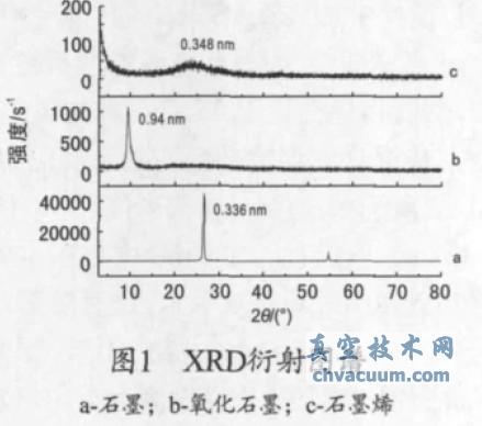 石墨原料、氧化石墨以及石墨烯的XRD 的衍射圖,見圖1。從圖1a 可看出,石墨(002) 衍射峰在2θ 為26.5。處非常尖銳,對應層間距為0.336 nm,說明其石墨化程度高,微晶片層的空間排列非常規整;2θ 為54.6。處為石墨(004) 晶面衍射峰。從圖1b 可看出,石墨被氧化后,石墨(002) 晶面衍射峰基本消失,氧化石墨層狀結構的特征衍射峰(001)出現在9.4°處,層間距為0.94 nm,層間距得到大幅提高,層間范德華力減小,易于通過熱膨脹得到石墨烯,其層間距遠大于石墨層間距(0.336 nm),這歸于氧化后石墨層間引入大量含氧官能團(羥基、羧基、環氧基等)。從圖1c 可看出,當氧化石墨經過高溫膨脹還原后,氧化石墨位于9.4。處的衍射峰消失,且石墨化的峰發生寬化,強度較弱,2θ 為25.6°,d(002) 為0.348 nm說明石墨層間已經產生了熱剝離,還原后石墨片層尺寸減小,晶體結構完整性下降,無序度增加,得到無定型態石墨烯。