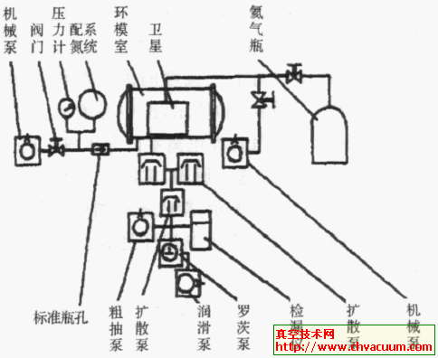 再把這些器件逐個(或成組)地裝入接在檢漏儀進(jìn)氣法蘭處的容器中,把此容器抽空后打開節(jié)流閥,這時原先進(jìn)入被檢器件的氦又會經(jīng)過漏孔放出來,檢漏儀就會給出漏率響應(yīng)。如果采用ZHP230氦質(zhì)譜檢漏儀,儀器可以直接給出漏率的數(shù)字顯示。衛(wèi)星的整體檢漏就是可以用這種方法,如圖9所示,將衛(wèi)星放入大型環(huán)模室中,利用環(huán)模設(shè)備的真空系統(tǒng)將環(huán)模抽成真空,先用輔泵進(jìn)行粗抽和預(yù)抽,在檢漏時先通過機(jī)械泵將衛(wèi)星及充氣管道抽成真空后,將氦氣充入衛(wèi)星中,壓力保持和衛(wèi)星工作的壓力一致,最后開啟氦質(zhì)譜檢漏儀用標(biāo)準(zhǔn)漏孔校準(zhǔn)儀器,就可以直接測量衛(wèi)星的漏率了。
