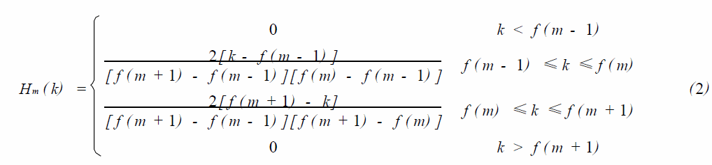 (3) 設計一個具有M 個帶通濾波器的濾波器組,采用三角濾波器,中心頻率在0 ~ F/2按Mel頻率分布;再根據Mel(f) 頻率與實際線性頻率f的關系計算出三角帶通濾波器組Hm(k) 。