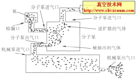 系統所選檢漏儀為Phoenix300 型檢漏儀,是真空應用下的氦檢漏儀,即抽空測試件同時進行檢漏。氦質譜檢漏儀作為檢漏方式的一種,因其靈敏度高、性能穩定、無污染等優點在保證產品質量方面起著越來越重要的作用。檢漏方式為逆擴散型,工作原理如圖1 所示。逆擴散檢漏是把被檢件接在分子泵出氣口一端,漏入的氦氣由分子泵出氣口逆著泵的排氣方向進入安裝在泵的進氣口端的質譜室內而被檢測。在質譜室內,根據質譜學原理,測出氦氣的多少,從而確定漏孔的漏率。