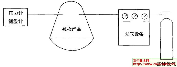 測試時對被檢件用干燥氮氣(或其他干燥氣體)通過充氣管道充到一定壓力(一般與被檢件的工作壓力一致) 后, 隔斷氣源, 觀察被檢件內壓力隨時間的下降情況。如果被檢件的容積為V,在Δt時間內,被檢件內的壓力降為ΔP, 那么被檢件的總漏率Q 為