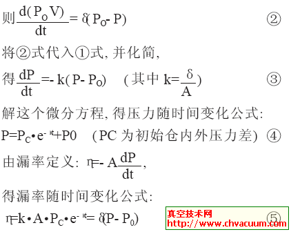 其中d( POV)/dt為單位時間漏入進真空倉內氣體多少的量度, 可認為它與倉內外的壓強差成正比, 假設這一比例常數為δ,
