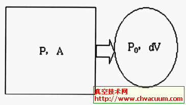 圖1 為真空干燥倉漏氣的示意模型: 假設容積為A, 壓強為P(P<P0),溫度為T 的真空倉經dt時間后,壓強變為P+dP;再假設漏入的氣體剛好被dV的容器收集, 該部分氣體為標準大氣壓P0。由于漏氣緩慢, 整個過程可認為是個絕熱過程。