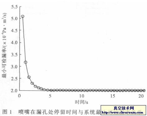 儀器最小可檢漏率為2×10-8 Pa·m3/s 時,噴嘴在漏孔處停留時間與檢漏系統(tǒng)最小可檢漏率關(guān)系見圖1。